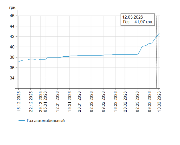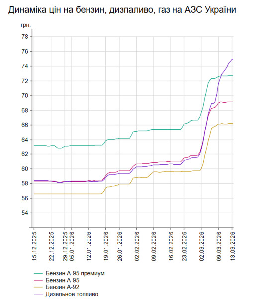 Зокрема, 13 березня було зафіксовано наступні середні показники вартості пального: бензин марки А-95 (преміум) – 72,71 грн/л; бензин марки А-95 – 69,14 грн/л; бензин марки А-92 – 66,2 грн/л (ціна виросла на 1 коп.), дизельне пальне – 74,91 грн/л (ціна зросла на 54 коп). Середня вартість автогазу складає 42,5 грн/л, що на 53 коп. більше, ніж у попередній день.