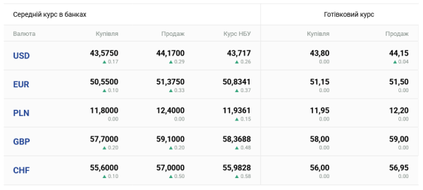 у monobank: 43,66 – 44,03 грн/$ та 50,82 – 51,50 грн/EUR.