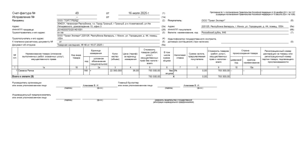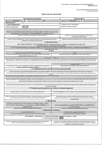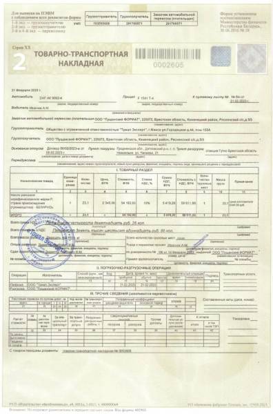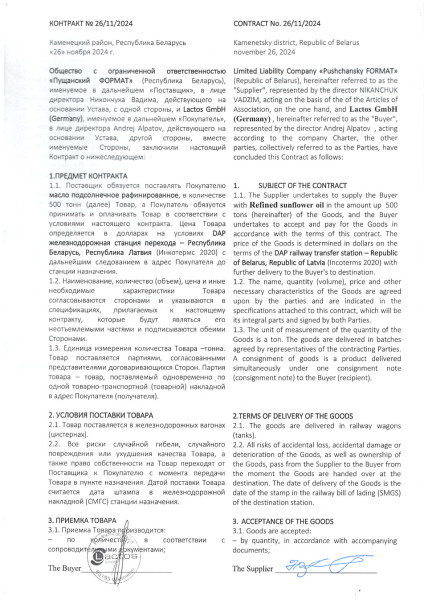 Згідно з наявним документом, 26 листопада 2024 року «Пущанский Формат» уклав контракт №26/11/2024 з німецькою компанією Lactos GmbH (Вісбаден) на постачання 500 тонн рафінованої соняшникової олії за ціною 1110 дол. США за тонну. Відповідно до контракту, поставка здійснюється залізницею на умовах DAP через білорусько-латвійський кордон «з подальшим прямуванням на адресу покупця до станції призначення».