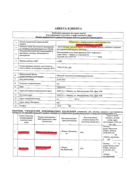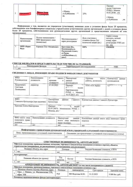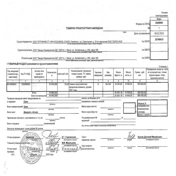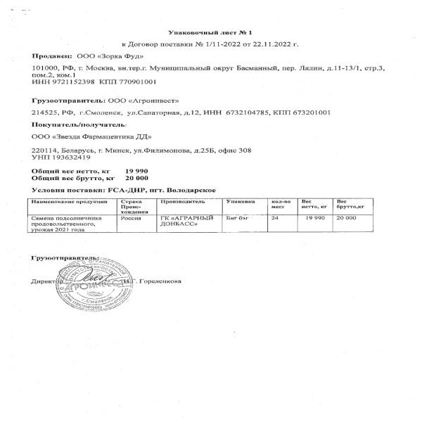 Як підтверджують документи BERLPOL, одним з основних партнерів «Аграрного Донбасу» з початку широкомасштабного вторгнення РФ є російська (фактично білоруська – але про це пізніше) фірма «Зорка Фуд». Ще у 2022 році між двома фірмами було укладено договір про доставку сільськогосподарської продукції. Документ передбачав передачу продукції партіями «в обсязі та асортименті, зазначених у Специфікаціях», з переходом права власності після підписання видаткових накладних. Термін дії – до 30 грудня 2023 року з можливістю автоматичного продовження.