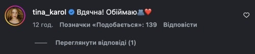 “Тіно Кароль, обіймаю! Тримаємось!”, – заявила Полякова. У відповідь Тіна написала: “Вдячна! Обіймаю”.