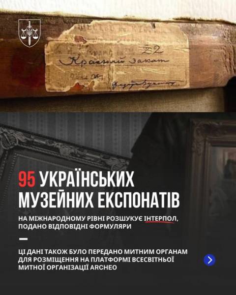 «З метою міжнародного розшуку викрадених об’єктів Офісом генерального прокурора відправлено до Департаменту міжнародного поліцейського співробітництва Національної поліції України 650 необхідних документів. Вже внесено у відповідні бази Інтерполу 95 об'єктів, робота з їх додавання продовжується», – додали у відомстві.