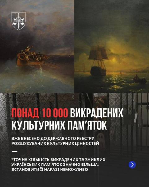 У структурі відзначили, що починаючи з 2022 року з тимчасово захоплених земель України викрадено десятки тисяч об’єктів культурної спадщини.