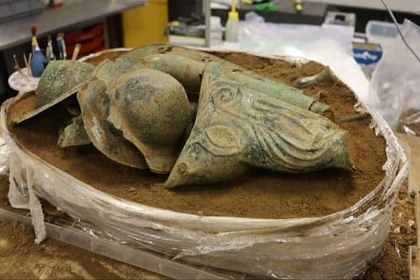 Серед виявлених артефактів також є бронзова голова кабана, яка спочатку була частиною військового прапора, п’ять умбонів (накладок на щити) та залізний предмет невідомого походження.