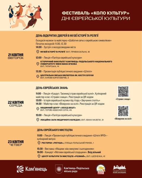 “Запрошуємо на фестиваль “Коло культур” – Дні єврейської культури в Кам’янці-Подільському. Це декілька днів, сповнених змістом, історією та живими звичаями: доповіді, оглядові екскурсії, музика, експозиції та майстер-класи, що розкривають багатогранний світ єврейської спадщини нашого міста. У програмі – від знайомства з культурою та кухнею до дискусій про історичну пам’ять і сучасне розуміння минулого”, – зазначено у повідомленні.