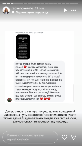 – Я вчора почула, що я не концертний директор, а ніщо. І свої обов’язки маю виконувати тільки вдома, – написала Катерина Репяхова.