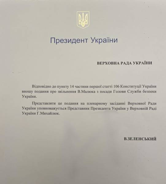 «У Верховну Раду надійшов лист від Президента України Володимира Зеленського про відставку Василя Малюка з посади керівника Служби безпеки України», – зазначив він.