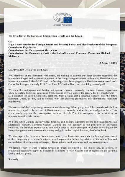 У зверненні, адресованому фон дер Ляєн, члени Європейського парламенту висловили «глибоке занепокоєння стосовно неприйнятних, неправомірних і провокаційних кроків угорського уряду», який 5 березня здійснив затримання українських інкасаторів та конфіскував активи Ощадбанку.