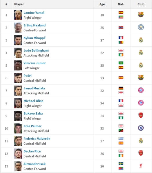 До топ-10 також увійшли Джуд Беллінгем (“Реал”), Вінісіус Жуніор (“Реал”), Педрі (“Барселона”), Джамал Мусіала (“Баварія”), Майкл Олісе (“Баварія”), Букайо Сака (“Арсенал”), Коул Палмер (“Челсі”), Федеріко Вальверде (“Реал”), Деклан Райс (“Арсенал”) та Александер Ісак (“Ліверпуль”).