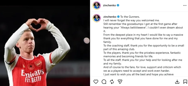 Сам Зінченко у соцмережі зазначив: “З великим очікуванням очікую початку”. Окрім того, він звернувся до “Арсеналу”, подякувавши клубу, партнерам по команді та вболівальникам за підтримку та досвід, і наголосив, що назавжди збереже приємні згадки про час у Лондоні.