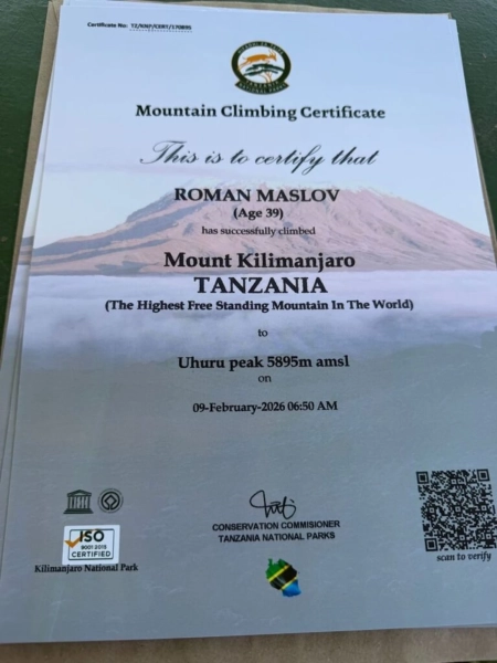 Маслов успішно піднявся на пік Ухуру – найвищу точку гори Кіліманджаро на висоті 5895 метрів. Ключовою рисою цього підйому стало встановлення національного рекорду України в категорії Спорт та Розміри, адже Роман Маслов самостійно розгорнув на вершині найбільший державний прапор, будь-коли піднятий на таку висоту однією особою
