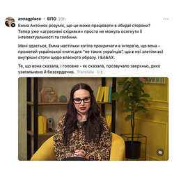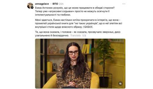 Коротка довідка. У соціальних мережах розгорівся конфлікт через блогерку та інтерв’юерку Емму Антонюк. Вона тривалий час допомагає поповнювати бібліотеки поблизу лінії фронту, але жителів східної України дуже обурили її висловлювання з інтерв’ю культурологині Маріам Найєм.
