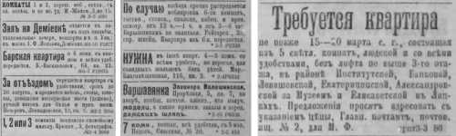 Типові оголошення зазвичай були максимально конкретними: «Квартира з 2-х кімнат та кухні, чиста, світла. Поділ, неподалік Гаванської. Здається сім’ї. Недорого, 25 руб./міс.», «Квартира в новому будинку на Банковій, 6 кімнат, електрика, опалення, ліфт. Для заможної сім’ї без маленьких дітей. 120 руб./міс.» або «Здається квартира на Хрещатику, 3 кімнати та вітальня, кухня та комора. Балкон з видом на бульвар. Для порядної родини. 65 руб./міс.».
