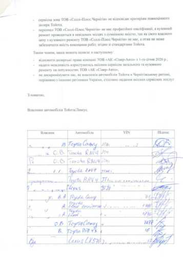 Натомість, після виходу статей, ми, як власники автомобілів Toyota та Lexus підтверджуємо факти, викладені в статтях, додаючи ще свої відгуки, щодо якості та загальної роботи так званого «дилера» ТОВ «Соллі-Плюс.Чернігів».