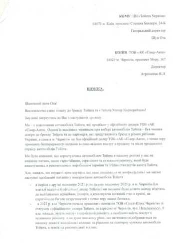 Після таких неприємних випадків, ми, як власники автомобілів Toyota та Lexus знову звертаємося до ПП «Тойота Україна», як до дистриб’ютора, який ухвалює рішення про відкриття нових а також призупинення діяльності дилерських центрів Toyota в Україні. Але на наш лист, відправлений на початку грудня 2025 року, досі немає жодної реакції від керівництва ПП «Тойота Україна».