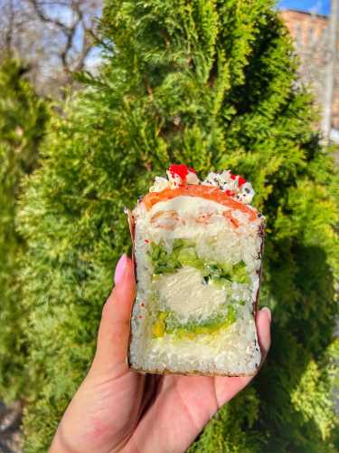 І якщо подивитися уважно, це більше суші, ніж паска. Замість тіста – рис, замість родзинок – огірки, а начинка – сир, солона червона риба і креветки. Навіть верхівку оздобили, тільки не глазур’ю з посипкою, а майонезом і шматочками лосося з огірком та авокадо. Ідеальний мікс для шанувальників ролів.