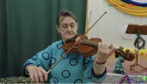 Зі світлом Тетяна Василівна почала частіше грати на улюбленій скрипці. Скрин з відео ГО Екоклуб youtube.com/watch?v=0KVFoJ_Qw1Y