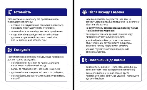 - до сигналу провідника пасажири залишаються на своїх місцях, не створюють натовп у проході або тамбурі вагону,