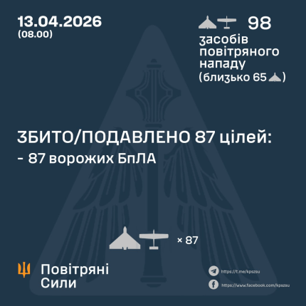 Упродовж нічної пори (з 00:10 13 квітня) супротивник здійснив напад 98 ударними БпЛА типу Shahed, Гербера, Італмас та безпілотними апаратами інших видів з напрямків: Орел, Брянськ, Курськ, Міллєрово, Приморсько-Ахтарськ – РФ, Гвардійське – тимчасово окупована АР Крим, орієнтовно 65 з них – “шахеди”.